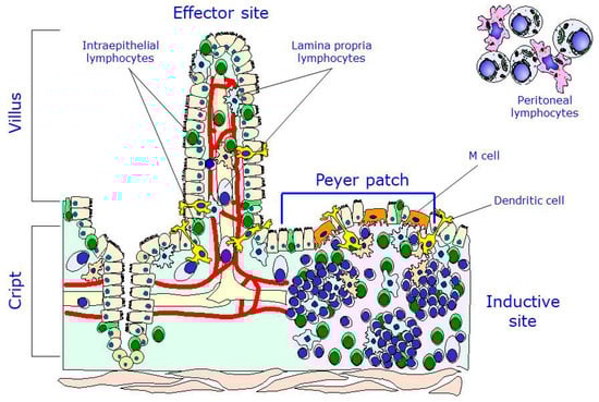 The intestinal immune system, also known as gut-associated lymphoid tissue (GALT), is a secondary lymphoid organ that is responsible for the processing of the antigens that interact with the intestinal mucosa and of the dissemination of the immune response [26]. There are two main locations of lymphocytes in the intestine: the inductive sites, that is, where the immune response begins after stimulation by an antigen, of which the Peyer patches are the most typical, and the effector sites, that is, the ones that are responsible for executing and completing the response. There are also two main lymphocyte populations in the gut: the lymphocytes of the lamina propria (LPL), located in the internal part of the villus, and the intraepithelial lymphocytes (IELs), located among the enterocytes along the villus. It is worth mentioning that, in addition to the Peyer patch lymphocytes (PPLs), the peritoneal lymphocytes, particularly the B1 cells, are important precursors of one population of plasmatic cells found in the lamina propria. Therefore, two main inductive populations may be found at the intestinal level: the B2 cells, which reside in the Peyer patches, and the B1 cells, which reside in the peritoneum (Figure 2) [27].
