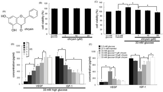 Chemical structure (A) and retinal pigment epithelial cytotoxicity (B) of chrysin, and the inhibitory effects of chrysin on cell proliferation by glucose (C), and temporal responses (D) and the inhibition of antivascular endothelial growth factor (VEGF) and insulin-like growth factor-1 (IGF-1) secretion by chrysin (E) in human retinal pigment epithelial (RPE) cells. Cells were incubated with 33 mM of glucose in the absence and presence of between 1–20 μM chrysin for up to six days. Cells were also incubated with 5.5 mM of glucose and 27.5 mM of mannitol as osmotic controls. After RPE cells were cultured in high glucose media, cell viability was measured by using MTT (3-(4,5-dimethylthiazol-2-yl)-2,5-diphenyltertrazolium bromide) assay (B and C, 100% viability with 5.5 mM of glucose). The secretion of VEGF and IGF-1 was measured with commercial ELISA kits (D and E). * Values in bar graphs (mean ± standard error of the mean (SEM), n = nine independent experiments) indicate significant different at p < 0.05.
