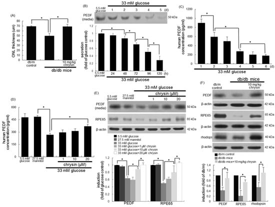 Restoration of outer nuclear layer (ONL) thickness (A), time course responses of production of pigment epithelium-derived factor (PEDF) by glucose (B,C) and the induction of PEDF, RPE65, and rhodopsin by chrysin (D–F). Human retinal pigment epithelial (RPE) cells were incubated with 33 of mM glucose in the absence and presence of 1–20 μM chrysin for up to 6 days. Cells were also incubated with 5.5 mM of glucose and 27.5 mM of mannitol as osmotic controls. The db/db mice were orally supplemented with 10 mg/kg of chrysin daily for 10 weeks. The db/m mice were introduced as control animals. The secretion of PEDF was measured with ELISA kits (C,D). Culture media, cell lysates, and retinal tissue extracts were subject to Western blot analysis with a primary antibody against PEDF, RPE65, and rhodopsin (B,E,F). β-actin protein was used as a cellular internal control for RPE cells. Bar graphs (mean ± SEM, n = nine independent experiments) in the bottom panels represent the densitometric results of upper blot bands. * values in bar graphs indicate significant different at p < 0.05.