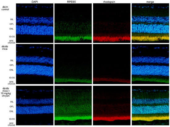 The visual cycle occurring between the photoreceptors and RPE regenerates 11-cis-retinal through a series of steps involving specialized enzymes and retinoid binding proteins [18,36]. RPE65 is a critical enzyme responsible for the conversion of all-trans-retinyl esters to 11-cis-retinal during phototransduction [17]. When RPE cells were stimulated with 33 mM of glucose, the cellular expression of RPE65 markedly decreased (Figure 2E). However, treatment with ≥1 μM of chrysin elevated the RPE65 expression to the glucose control level. This study attempted to show that chrysin ameliorated the RPE65 induction in diabetic animal retina. As expected, the eye tissue levels of RPE65 and rhodopsin dropped in db/db mice (Figure 2F). When db/db mice were orally administrated with 10 mg/kg of chrysin for 10 weeks, the tissue levels of these proteins were boosted. Also, the induction of RPE65 and rhodopsin was examined in mouse retina by using a double immunohistochemical staining of FITC and Cy3. In db/m control retina, the RPE65 in the photoreceptor inner/outer segment (IS/OS) layer was strongly green-stained, and the retinal rhodopsin was red-stained in retina (Figure 3). However, there was a weak staining of RPE and rhodopsin in the IS/OS layer of diabetic mouse retina, as compared to that of the db/m control. Oral supplementation of chrysin to db/db mice improved the induction of RPE65 and rhodopsin, in which the double staining of FITC and Cy3 was indistinguishable from that of the db/m control (Figure 3).