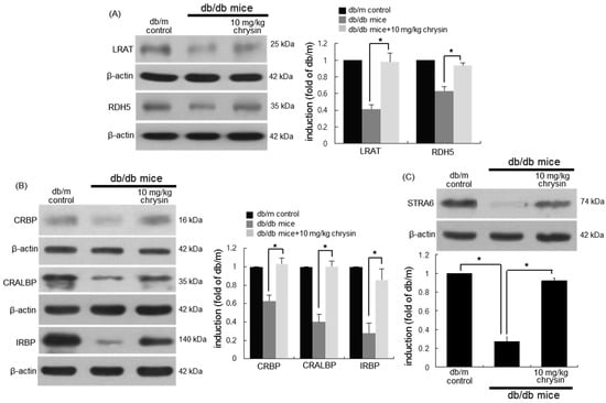 Elevation of retinal tissue induction of visual cycle enzymes (A), and retinoid binding proteins (B), and stimulated by retinoic acid 6 (STRA6, C) in chrysin-treated mice. The db/db mice were orally supplemented with 10 mg/kg of chrysin daily for 10 weeks. The db/m mice were introduced as control animals. Mouse retinal tissue extracts were subject to Western blot analysis with a primary antibody against each target protein of lecithin-retinol acyltransferase (LRAT), retinol dehydrogenase 5 (RDH5), cellular retinol binding protein (CRBP), cellular retinaldehyde-binding protein (CRALBP), interphotoreceptor retinoid-binding protein (IRBP), or STRA6. β-actin protein was used as an internal control. Bar graphs (mean ± SEM, n = nine independent experiments) in the bottom or right panels represent densitometric results of upper blot bands. * Values in bar graphs indicate a significant difference at p < 0.05.