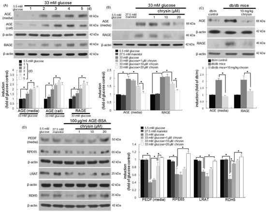Temporal induction of advanced glycation end products (AGE) and receptor for advanced glycation end product (RAGE) by glucose (A), the inhibitory effects of chrysin on their induction (B,C), and restoration by chrysin of PEDF and retinal visual cycle enzymes in AGE-BSA-exposed human retinal pigment epithelial (RPE) cells (D). RPE cells were incubated with 33 mM of glucose in the absence and presence of 1–20 μM chrysin for up to five days. Cells were also incubated with 5.5 mM of glucose and 27.5 mM of mannitol as osmotic controls. The db/db mice were orally supplemented with 10 mg/kg of chrysin daily for 10 weeks. The db/m mice were introduced as control animals. Culture media, cell lysates, and mouse retinal tissue extracts were subject to Western blot analysis with a primary antibody against AGEs, RAGE, PEDF, RPE65, lecithin retinol acyltransferase (LRAT), and retinol dehydrogenase 5 (RDH5). β-actin protein was used as an internal control. Bar graphs (mean ± SEM, n = nine independent experiments) in the bottom or right panel represent densitometric results of upper or left blot bands. * Values in bar graphs indicate a significant difference at p < 0.05.