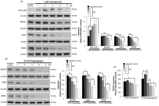 Temporal inhibition of retinal visual cycle enzymes (A,B) and PEDF (C) in endoplasmic reticulum (ER) stress-faced human retinal pigment epithelial (RPE) cells. RPE cells were incubated in the absence and presence of 1 μM of tunicamycin and 10 nM of thapsigargin for up to five days. Cell lysates were subject to Western blot analysis with a primary antibody against activating transcription factor 6 (ATF6) p50, RPE65, LRAT, and RDH5 (A,B). β-actin protein was used as an internal control. Bar graphs (mean ± SEM, n = nine independent experiments) in the right represent the densitometric results of left blot bands (A,B). The secretion of PEDF in RPE cell culture media was measured with an ELISA kit (C). * Values in bar graphs indicate a significant difference at p < 0.05.