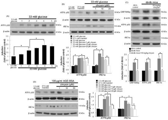 Induction of ER stress by glucose and AGE-BSA and its inhibition by chrysin. Human retinal pigment epithelial (RPE) cells were incubated with 33 mM of glucose (A,B) or 100 μg/mL of AGE-BSA (D) in the absence and presence of between 1–20 μM of chrysin for up to five days. Cells were also incubated with 5.5 mM of glucose and 27.5 mM of mannitol as osmotic controls. The db/db mice were orally supplemented with 10 mg/kg of chrysin daily for 10 weeks (C). The db/m mice were introduced as control animals. Cell lysates and tissue extracts were subject to Western blot analysis with a primary antibody against ATF6 p50, inositol-requiring enzyme 1α (IRE1α), and 78 kDa glucose-regulated protein/binding immunoglobulin protein (GRP78/Bip). β-actin protein was used as an internal control. Bar graphs (mean ± SEM, n = nine independent experiments) in the bottom represent the densitometric results of upper blot or left bands (A,B). * Values in bar graphs indicate a significant difference at p < 0.05.