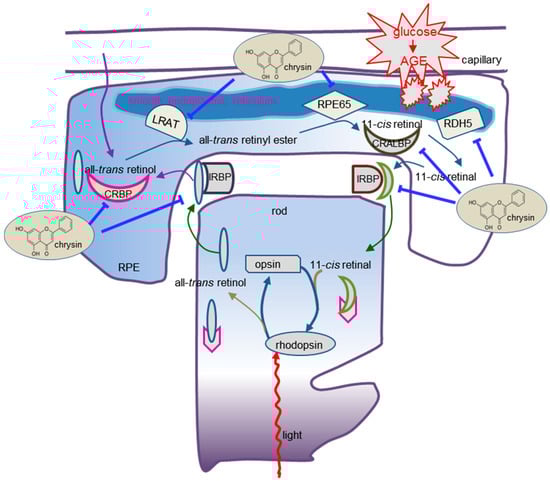 In summary, this study investigated the capability of chrysin in counteracting the diabetes-mediated malfunction of the visual cycle in glucose-exposed RPE cells and diabetic mice. Chrysin reciprocally influenced the production of VEGF, IGF-1, and PEDF in glucose-stimulated RPE cells and diabetic eyes. This compound neutralized the hyperglycemia-elicited reduction of the retinoid visual cycle components of RPE65, LRAT, RDH5, CRBP, CRALBP, IRBP, and STRA6 in retina. In addition, chrysin encumbered the formation of AGEs and RAGE in diabetic eyes due to glucose insults, leading to the loss of RPE enzymes for the visual cycle. Furthermore, chrysin blocked the ER stress of RPE cells evoked by glucose and AGEs in diabetic mice. Therefore, chrysin was a therapeutic drug antagonizing the malfunction of the retinal visual cycle, leading to the loss of retinal vision in cellular or animal models of diabetic complications. It can be assumed that the protective effects of chrysin on the malfunctioned visual cycle in diabetic eyes may be, at least partly, due to its glucose-lowering effects.