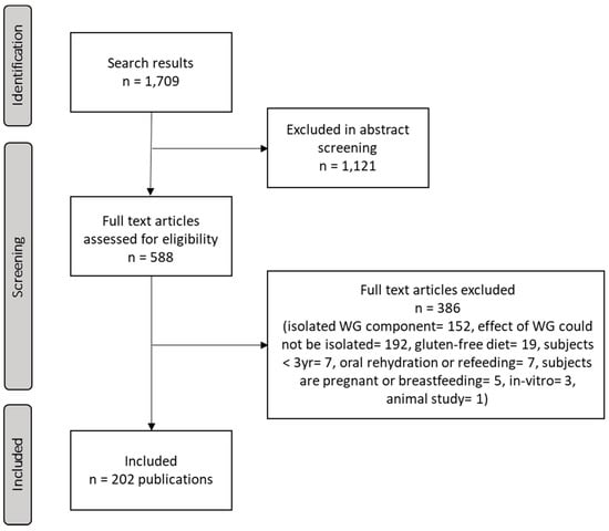 For secondary screening, full-text manuscripts were obtained. During this phase, additional exclusion criteria were applied to better restrict the results to whole grain interventions most relevant to the general population. These exclusion criteria included the following: (i) the intervention did not allow the effect of whole grain to be isolated (including whole grain products with added bran); (ii) the intervention was only an isolated component of whole grain (e.g., bran, germ, fiber); (iii) subjects were following a gluten-free diet; (iv) subjects were <3 years old (purpose was complementary feeding practices with enriched whole grains on nutritional status or to assess digestibility of grain product in infants); (v) the study was specific to oral rehydration or refeeding therapies; (vi) subjects were pregnant or breastfeeding women; (vii) in vitro studies; (viii) animal studies. Reasons for exclusion during this phase were documented.