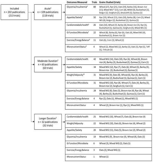 Trials that lasted ≤1 day were labelled “acute” trials (n = 118 trials among 109 publications), while studies of moderate (>1 day to 6 weeks, n = 63 trials) and long (>6 weeks, n = 32 trials) durations are referred to as “longer duration” trials (n = 95 trials among 95 publications). Two publications detailed both acute and longer duration trials [,]. The number of trials by duration, with each major outcome category and the type of grain interventions, are summarized in Figure 2. The majority of the acute trials (75%, n = 88) focused on glycaemia and/or insulinemia outcomes, while the major outcomes in the longer (moderate and long) duration trials were cardiometabolic health measures (71%, n = 67), measures of appetite/satiety (57%, n = 54) and measures of weight/adiposity (56%, n = 53).