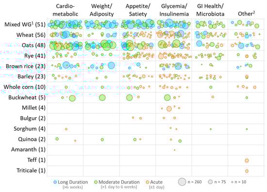 1 Each bubble represents a single publication within each grain by outcome category and the size corresponds to the study sample size; position of bubbles is random within each cell; trial bubbles are duplicated between outcome or grain categories when >1 outcome of grain type was studied; 1 Mixed Whole Grain (WG) group includes combinations of 2 or more WGs, WG diets and unspecified WG foods (ex: WG bread); 2 Other outcomes include exercise performance, micronutrient status, clinical blood and urine measures and other metabolites.