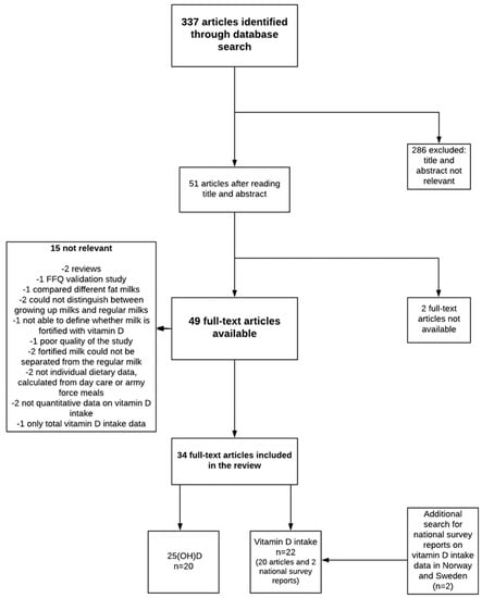 Figure 1 shows the literature search and study selection process. We found 337 articles that were published between 1993 and 2017, and their titles and abstracts were scanned. Fifty-one full-text review papers were selected. Of these, two were unavailable and the corresponding author could not be reached, and 15 were not relevant to the research questions. Thus, 34 papers were included in the review process. Of these, 20 provided data on the 25(OH)D status, and 20 provided data on vitamin D intake. Additionally, intake data in national surveys covering countries with a fluid milk vitamin D fortification policy that were not covered in the PubMed search (Norway, Sweden) were explored. One Norwegian [] and one Swedish report [] in local language were found and were included to provide data on vitamin D intake and the contribution of milk in those countries. Nationally representative data from other countries with a vitamin D fortification policy were already found in the literature search.