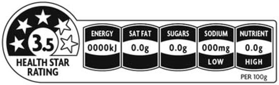 In Australia, manufacturers can advertise the healthiness of their product offerings in a number of ways. Two government-endorsed systems are regulated health claims on product packaging, and voluntary front-of-pack nutrition labels. The Nutrient Profiling Scoring Criterion (NPSC) was developed by Food Standards Australia New Zealand (FSANZ) to determine whether or not a product is eligible to display a health claim []. The NPSC algorithm assigns a score based on the overall nutritional content of a product. Based on the score received, a product is deemed to either meet the criteria to make a health claim or not. In 2014, the Australian and New Zealand governments endorsed the use of a voluntary interpretive front-of-pack labelling system, the Health Star Rating (HSR), for packaged foods []. The HSR system aims to make it easier for consumers to identify healthier products in the same category, and to be consistent with the 2013 Australian Dietary Guidelines. The HSR algorithm assigns a product a rating between half a star and five stars, in half-star increments, with a higher number of stars indicating a healthier product (Figure 1).