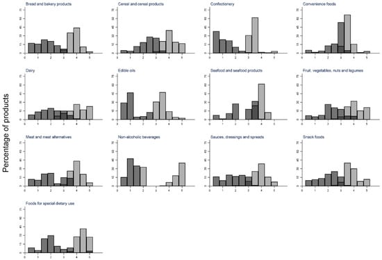 The FoodSwitch database contained information on 47,116 products, of which 41,297 were included in these analyses. Another 5819 (12.4%) products were excluded for one of the following reasons: not required to display a NIP (n = 970), in an excluded category (n = 2110), or data on an essential nutrient required for the calculation of HSR or NPSC scores (i.e., energy, saturated fat, total sugar, sodium, protein) were missing (n = 2739). The number of products in each major food category ranged from 318 in “foods for special dietary use” to 5515 in “dairy”.