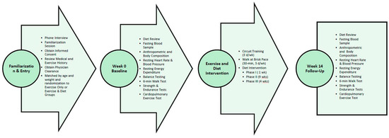 This study was conducted at a university-based research setting as a randomized, parallel, prospective diet and exercise intervention trial. Females between the ages of 60 and 75 years were randomly assigned to one of three experimental groups: no diet intervention + exercise (E); higher carbohydrate diet + exercise (HC); or higher protein diet + exercise (HP). Participants partook in the Curves® (Curves International, Waco, TX, USA) fitness and/or weight management program for 14 weeks. Those assigned to the diet interventions were assigned similar hypo-energetic diets comprised of higher carbohydrate or higher protein macronutrient distributions. Primary outcome variables included body weight, body composition (i.e., fat mass, fat free mass, percent body fat), and resting energy expenditure. Secondary outcome variables included resting hemodynamics, aerobic capacity, muscular strength, muscular endurance, functional capacity and balance, metabolic and appetite-related hormones, and clinical blood panels.