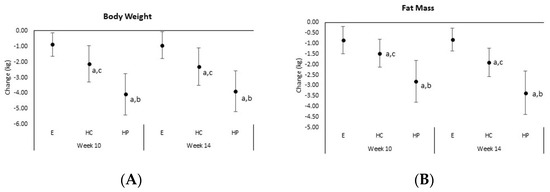 (A) Body weight, (B) fat mass, (C) fat-free mass, (D) body fat. Mean changes with 95% confidence intervals (CIs) from baseline in body composition variables for the exercise only (E), higher carbohydrate (HC), and higher protein (HP) groups. Means and 95% CIs completely below baseline represent a significant change over time. a = p < 0.05 difference from E; b = p < 0.05 difference from HC; c = p < 0.05 difference from HP.