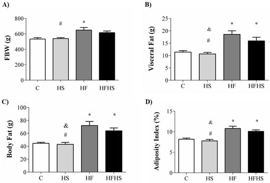 Body weights and fat mass content in rats fed either the control diet (C; n = 12), high-sugar diet (HS; n = 14), high-fat diet (HF; n = 13) or high-fat and high-sugar diet (HFHS; n = 13). (A) FBW = final body weight; (B) visceral fat pad; (C) BF: body fat; (D) AI: adiposity index. Data are presented as the mean ± SEM. One-way ANOVA for independent samples followed by Tukey post hoc test. p < 0.05 vs. * C; # HF vs. HS; & HFHS vs. HS.
