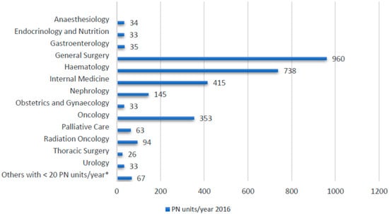 Distribution according to the clinical requesting service. * Others with <20 PN units/year include Cardiac Surgery (9), Cardiology (19), Pneumology (9), Neurology (4), Oral and Maxillofacial Surgery (11), Orthopaedic Surgery (9), Plastic Surgery (3) and Vascular Surgery (3). PN: Parenteral Nutrition.