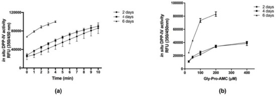 Taking this into consideration, cells were seeded in 96-well plates at a high density (5 × 104 cells/well) to rapidly achieve confluence and they were then cultured for 2, 4, and 6 days. Gly-Pro-AMC was selected as the specific fluorescent substrate for DPP-IV activity, since DPP-IV selectively metabolizes this substrate, releasing the AMC fluorophore, which emits fluorescence signals at 450 nm upon excitation at 350 nm. DPP-IV activity was tested after 2, 4, and 6 days old Caco-2 cells cultures, using 50 µM Gly-Pro-AMC in PBS, and the fluorescence signal was monitored up to 10 min. Figure 1a shows that the detected relative fluorescence units (RFUs) steadily increased as a function of time, reaching an overflow of the fluorescent signal at different times depending on the level of DPP-IV activity at each age of the cells. Subsequently, DPP-IV activity was tested as a function of substrate concentration (from 25 to 400 µM), using an appropriate time interval to be in the linear portion of the enzyme activity, avoiding signal overflow.