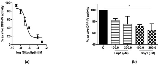 Ex vivo assay of circulating DPP-IV in human serum: (a) sitagliptin showed a dose-dependent inhibition of circulating DPP-IV with an IC50 of 0.2 µM; (b) Lup1 inhibited circulating DPP-IV activity by 18.1% and 24.7% at 100 µM and 300 µM, respectively. Soy1, at the same concentrations, showed a slightly higher inhibitory activity of 27.7% and 35.0%, respectively. Data are the means ± SD of three experiments performed in triplicate. *: p > 0.05.