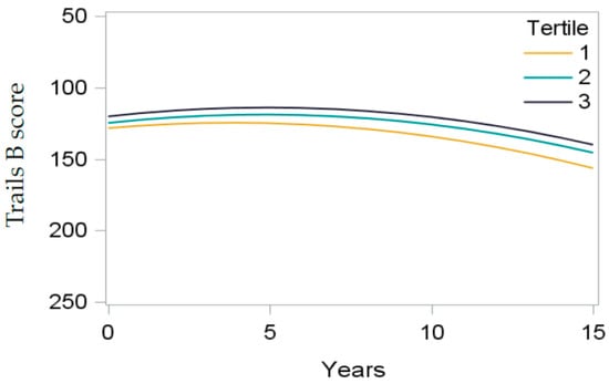 Modeled trajectories of Trails B performance over time as a function of plant polyunsatured fatty acid/vitamin E factor score tertile. Plots are based on all model coefficients using plant PUFA/vitamin E factor score tertile group-specific mean values for covariates: age, sex, education, total energy intake and practice effect. The axis for Trails B is reversed so that downward sloping lines show decreasing performance.