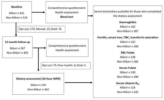 The population of adults aged 85+ are expected to increase six-fold by 2068 [1] and in the coming years the older Māori population will increase at a rate higher than non-Māori [2]. The demographic shift may place increased burden on both older adults and the healthcare system. Adequate energy and nutrient intake is essential to prevent malnutrition among older adults, particularly in older Māori who are more likely to be at high nutritional risk compared to non-Māori [3,4]. Iron, folate, and vitamin B12 are largely intertwined in the production of red blood cells (RBC) and are the most common nutrient deficiencies associated with anemia [5,6]. Deficiency in these nutrients have also been implicated in impaired cognition and depression [7,8], increased risk of falls [9], decreased quality of life and increased risk of mortality in older adults [10,11,12,13].