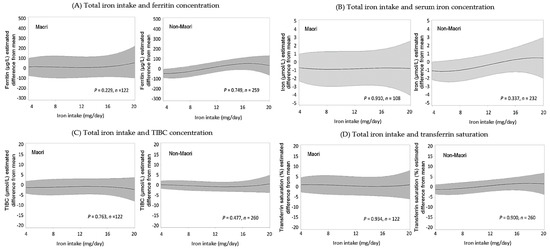 For Māori, dietary iron intake was not significantly associated with serum ferritin (p = 0.229) or serum iron levels (p = 0.910) (Figure 2). For non-Māori, a positive but non-statistically significant trend was observed for serum ferritin and serum iron concentration with increasing iron intake. For both Māori and non-Māori iron intake was not a significant predictor of TIBC or transferrin saturation.