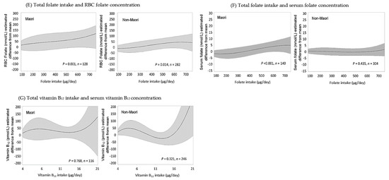 Overall, for Māori and non-Māori participants dietary iron intakes and biomarkers for iron were largely adequate. Similarly, the EAR for vitamin B12 was met by three quarters of Māori and non-Māori participants. Māori had higher intakes of vitamin B12 (p = 0.038) and serum vitamin B12 (p = 0.026) compared to non-Māori. The EAR for dietary folate was met by less than half of Māori and non-Māori suggesting a sub-optimal intake. A higher dietary folate intake was associated with increased RBC folate for Māori (p = 0.001) and non-Māori (p = 0.014) and with increased serum folate for Māori (p < 0.001), suggesting that a higher intake is related to higher serum biomarker levels. Folate intake >215 µg/day was associated with a reduced risk of deficiency in RBC folate for Māori (p = 0.001) which suggests that increased dietary folate intake is positively associated with RBC folate.