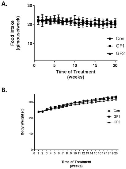 Ten-week-old mice were fed diets, which were supplemented with GrandFusion diets (2%) for 20 weeks. The diets were as follows: Group 1 received the normal diet alone; Group 2 received a 2% GrandFusion (GF1, NF-216—Fruit and Veggie #1 Blend) with the normal diet; and Group 3 received a 2% GrandFusion diet (GF2, NF-316—Fruit #2 Blend) with the normal diet. These are same diets that were used in previous studies [9,10]. The animals were examined for food intake and body weight every week for the twenty weeks of feeding. As seen in Figure 1A, the mice on all diets maintained a constant intake of food over the course of the study. In addition, consistent with the food intake, all of the mice showed a similar gain in weight over the twenty weeks, although the GF1 and GF2 mice only showed a modest increase in body weight.