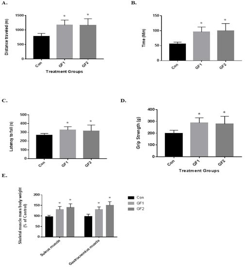 To determine the impact of the diets on exercise endurance and activity, the mice were subjected to several paradigms (Figure 2). In Figure 2A, the mice on both the GF1 and GF2 supplemented diets showed a 1.5-fold increase in the distance traveled compared to the control diet mice (Figure 2A). In addition, the GF1 and GF2 mice demonstrated a 1.7-fold and 1.8-fold increase in time on the treadmill (Figure 2B). When the mice were subjected to the rotarod testing, the mice showed a 1.2-fold increase in the time to fall for both the GF1 and GF2 supplemented diets when compared to the control diet (Figure 2C). When the GF1 and GF2 were compared to the control diet for grip strength, there was a 1.45-(GF1) and a 1.40-fold (GF2) increase. Finally, both the soleus (SM) and gastrocnemius (GM) muscles were removed from the mice after the twenty-week treatment. The GF treated mice showed a 1.33-(SM) and a 1.45-fold (GM) increase for the GF1 diet, while there was a 1.32-(SM) and 1.55-fold (GM) increase after the GF2 diet. These results show that the GF supplemented diets significantly increased exercise endurance in the mice compared to the control diet animals. As indicated above, the mice showed a modest increase in body weight, which is consistent with the increase in muscle mass. In addition, a decrease in fat might account for the changes (not determined).