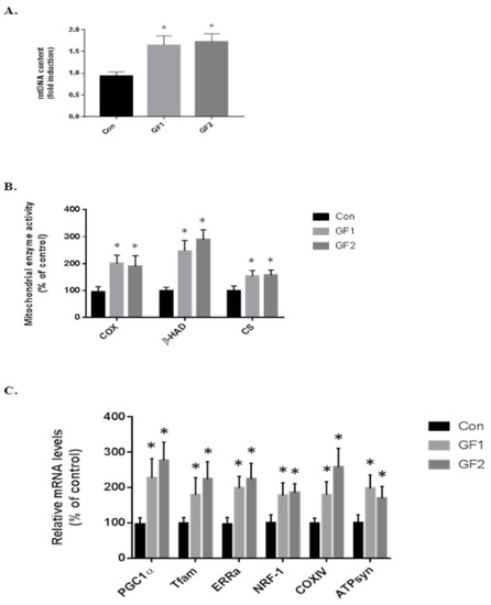 To determine the role of the skeletal muscle cell mitochondria in increasing endurance in the mice treated with GF diets, at the end of the study, the skeletal muscle was removed and examined for mitochondria DNA content at the end of the study (mtDNA, Figure 3A). As seen in the figure, there was an increase of 1.76-(GF1) and 1.85-fold (GF2) compared to the control diet fed mice. Figure 3B shows the changes in mitochondrial enzymes. The protein was isolated and subjected to enzymatic analysis. When mice were treated with the GF diets, there were significant increases in cytochrome c oxidase (COX), β-hydroxyacyl-CoA dehydrogenase (β-HAD) and citrate synthase (CS) (Figure 3B). As seen in the figure, COX increased 2.0-(GF1) and 1.9-fold (GF2); β-HAD was increased 2.5-(GF1) and 2.9-fold (GF2); and CS was increased 1.5-(GF1) and 1.6-fold (GF2) compared to control mice. Finally, we analyzed several mitochondrial mRNAs to establish the role of GF supplementation on mitochondrial function (Figure 3C). The increases in mRNA expression were: PGC-1α–2.3-(GF1) and 2.8-(GF2); Tfam–1.8-(GF1) and 2.3-(GF2); ERRα–2.0-(GF1) and 2.3-(GF2); NRF-1–1.8-(GF1) and 1.85- (GF2); COXIV–1.8-(GF1) and 2.6-(GF2); ATPsyn–2.0-(GF1) and 1.7-(GF2) fold. These results demonstrate an increase in mitochondrial activity and function when the mice were given GF diets. There were no significant differences between the GF groups.