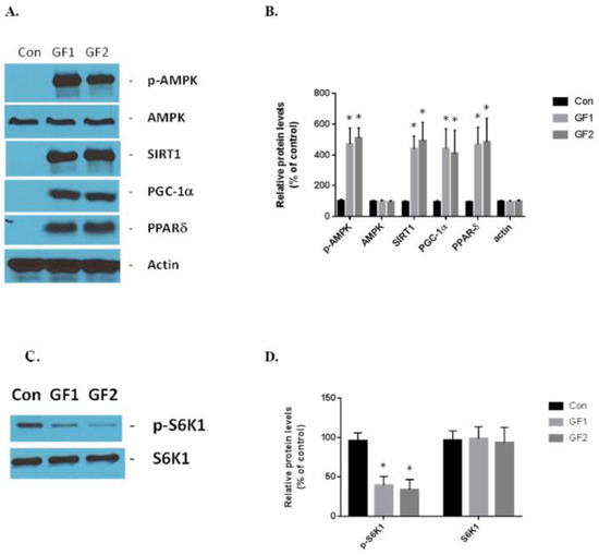 The GF supplemented diets stimulate exercise signaling in the skeletal muscle cells. AMPK, SIRT1, PGC-1α and PPARδ are the critical sensors and regulators of energy expenditure and biogenesis in the mitochondria [4]. GF diets increased the expression of phosphorylated AMPK, SIRT1, PGC-1α and PPARδ in vivo compared to the control mice (Figure 4A,B). The increases in protein expression were: pAMPK–4.7-(GF1) and 5.1-(GF2); SIRT1–4.4-(GF1) and 5.0-(GF2); PGC-1α–4.4-(GF1) and 4.1-(GF2); and PPARδ–4.7-(GF1) and 4.85-(GF2) fold. Finally, we examined the expression of S6K1 and its phosphorylated form in the presence of GF supplemented diets (Figure 4C,D). We found that p-S6K1 decreased by 60% and 67% after treatment with GF1 and GF2 diets, respectively, compared to the control diets. These data support the hypothesis that the GF supplemented diets enhance mitochondrial biogenesis and function while suppressing autophagy [13].