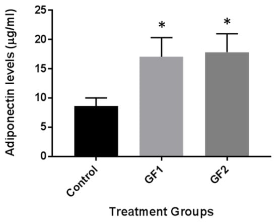 Finally, we examined the impact of the different diets (GF1 and GF2) on adiponectin levels in the plasma of the mice. Recent studies with caloric restriction showed an increase in adiponectin levels and promoted blood flow recovery following hindlimb ischemia in mice subjected to exercise [14,15,16]. The mice, which were fed control chow or chow with the diets, were examined for adiponectin levels. As seen in Figure 5, adiponectin levels were increased in the mice that were fed with GF1 and GF2 diet compared to the mice that were given control chow. These data suggest that GF regulation of adiponectin may have cardiovascular benefits that help to enhance the outcomes of enhanced function.
