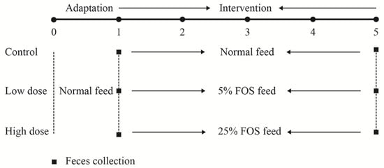 Experimental design. Thirty mice were randomly assigned to three groups, named the control, low-dose, and high-dose groups. During the adaptation period (first week), the mice were fed normal feed. During the intervention period, mice in the control group continued to receive normal feed, while mice in the low- and high-dose groups received the fructooligosaccharides (FOS) feed, containing 5% or 25% FOS (w/w), respectively. Feces were collected before and after FOS treatment on the first and fifth week.