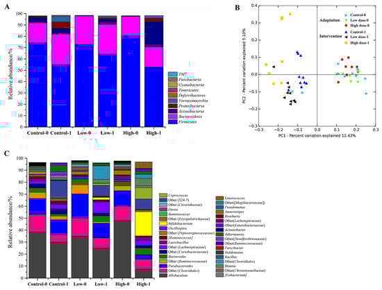 The bacteria in the mice feces mainly belonged to the phyla Firmicutes, Bacteroidetes, Actinobacteria, and Proteobacteria, among which Firmicutes was the most abundant phylum, accounting for over 70% (Figure 3A). After intervention, the relative abundance of Bacteroidetes, Proteobacteria, and Verrucomicrobia increased and the relative abundance of Firmicutes decreased in the control group. In the low-dose group, there was a significant increase in the relative abundance of Actinobacteria from 0.3% to 4.2% (p < 0.05). In the high-dose group, the relative abundance of Actinobacteria was even higher at 22.3%, indicating that the Actinobacteria abundance was positively related to the dose of FOS.