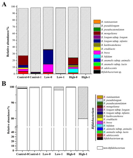 Effects of different doses of FOS on the relative abundance of Bifidobacterium species in the Bifidobacterium genus (A) and in the fecal microbiota (B). “0” stands for before FOS intervention and “1” stands for after FOS intervention.