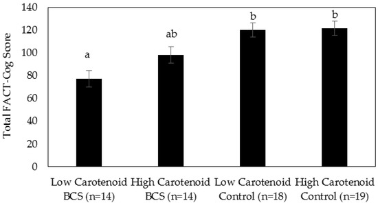 Serum carotenoids and cognitive complaints: Serum carotenoid concentrations by group are described in Table 4. ANCOVA was used to determine the differences in FACT-Cog scores between serum carotenoid status groups. After adjustment for age, there was a statistically significant difference in FACT-Cog scores between the groups, F (3, 60) = 9.498, p < 0.001, partial η2 = 0.322. The low-carotenoid BCS had significantly lower FACT-Cog scores (more cognitive complaints) compared to the low-carotenoid controls (Mdiff = −43.0, 95% CI [−68.8, −17.1], p < 0.001) and high-carotenoid controls (Mdiff = −44.54, 95% CI [−71.1, −18.0], p < 0.001) (Figure 1). However, FACT-Cog scores in high-carotenoid BCS were not significantly different than those of the low-carotenoid BCS, or low- or high-carotenoid controls.
