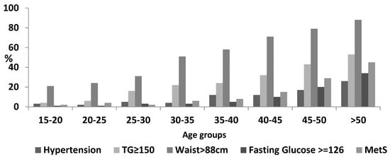 Prevalence of metabolic syndrome and its components by age groups. TG: triglycerides; MetS: metabolic syndrome.