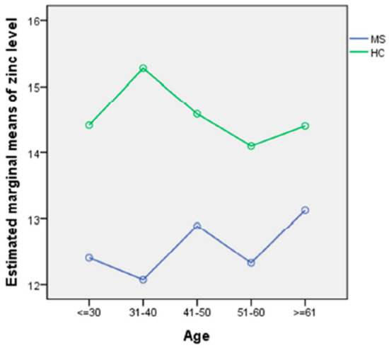 Univariate analysis underlined the group difference in particular (p < 0.001), and the absence of an effect of age on zinc levels (p = 0.8). There was no interaction between age and group (p = 0.5). The profile plot did not show any deviation of values depending on age (Figure 1).