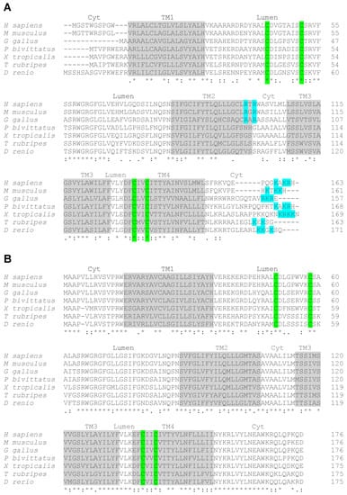 Sequence alignment of vertebrate vitamin K oxido reductases. Vertebrate VKORC1 (A) and VKORC1L1 (B) sequences from humans (H. sapiens), mice (M. musculus), chickens (G. gallus), Burmese pythons (P. bivittatus), clawed frogs (X. tropicalis), Japanese puffer fish (T. rubripes) and zebrafish (D. rerio). The predicted four transmembrane domains (TM 1-4) are highlighted in grey. The localization of the different loops in the cytosol (Cyt) or in the lumen (Lumen) is indicated above the sequences. The conserved four cysteine residues involved in the enzymatic activity of the proteins are highlighted in green. In VKORC1 the c-terminus di-lysine motif and the internal di-arginine motif, potentially involved in ER retention, are highlighted in blue. Consensus symbols are included below the alignment. A single asterisk (*) indicates a fully conserved residue; a colon (:) indicates a strongly conserved residue; and a period (.) indicates moderate or weak conservation.