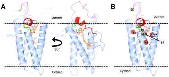 Whether human VKORC1 is organized in a four-TM structure, like the bacterial VKOR homologue, has been controversial, since the biochemical analysis of human VKORC1 topology generated conflicting conclusions, supporting either a four-TM [,,,,,] or a three-TM model [,,]. Indeed, another model has been proposed for human VKORC1, in which the protein contains only three transmembrane helixes and where Cys43 and Cys51 are localized in the cytosol. A critical evaluation of the technical details, which could explain the discrepancy between some biochemical data and the structural biology predictions, has been published recently []. We note, most importantly, that the study of intact human VKORC1, using live cell cysteine labeling in combination with mass spectrometry, convincingly showed that a major fraction of Cys43, Cys51, Cys132 and Cys135 is oxidized in living cells, strongly suggesting that they are all located in the oxidative ER lumen []. Together with the structural data, these results support the four-TM model for human VKORC1 []. Importantly, biochemical and structural modeling predict that human VKORC1L1 is also organized as a four-TM protein (Figure 2A) and that the two loop cysteine residues of VKORC1L1 are essential for its activity [,].
