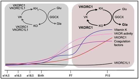 If VKORC1L1 can support vitamin K reduction and γ-carboxylation in the liver during the prenatal and perinatal period, why does it fail to compensate for the absence of VKORC1 after one week following birth? One plausible answer to this question was that VKORC1 and VKORC1L1 are differentially expressed during development. Gene expression analysis revealed that Vkorc1 and Vkorc1l1 expressions in the liver remain stable and comparable between the embryonic day 14.5 (e14.5) and birth (P0). However, the expression of Vkorc1 increases 10–20 fold between P0 and postnatal day 15 (P15), while the expression of Vkorc1l1 remains at the same level []. Liver VKOR enzymatic activity also increases robustly after birth, suggesting that the high postnatal level of VKOR activity can be mostly ascribed to VKORC1, as previously suggested by the very low level of VKOR activity in adult Vkorc1−/− livers []. The strong postnatal increase in VKORC1 is accompanied by the rapid and robust up-regulation of the expression of the gene encoding for the vitamin K-dependent coagulation factors, prothrombin, factor VII, factor IX and factor X. Moreover, the expression of the γ-carboxylase (Ggcx) and the presence of Gla proteins rise in the liver between P0 and P15, while the plasma level of carboxylated prothrombin is ~10-fold higher in P15 than in e16.5 mice []. Altogether, these results indicated that the presence of functional coagulation factors is significantly increased following birth and that this augmentation is sustained by a concerted up-regulation in the liver of the genes encoding these factors and only one of the two VKOR-encoding genes, i.e., VKORC1 (Figure 3). The transgenic overexpression of VKORC1L1, under the control of the human APOE promoter (APOE-Vkorc1l1) in the liver of Vkorc1−/− mice, was sufficient to restore γ-carboxylation and normal coagulation. In fact, Vkorc1−/−; APOE-Vkorc1l1 mice survive into adulthood, are fertile and do not display any apparent phenotype. Hence, VKORC1L1, when expressed at a sufficient level, can sustain vitamin K-dependent carboxylation in the adult liver and prevent bleeding and lethality [].