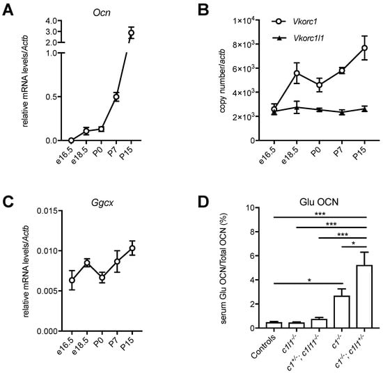 Developmental regulation of the vitamin K cycle in bones. (A–C) Calvaria from e16.5, e18.5, P0, P7 and P15 C57BL/6J mice were harvested, and the total RNA was extracted (mean ± standard error of the mean (SEM), n = 3). (A) Relative mRNA levels of the gene encoding osteocalcin (Ocn) were measured by quantitative PCR (qPCR) and normalized to the actin-β gene Actb. (B) Vkorc1 and Vkorc1l1 gene expressions were measured by qPCR and normalized to Actb. The copy number was quantified using plasmid DNA, containing either Vkorc1 or Vkorc1l1 cDNA as a standard. (C) Relative mRNA levels of Ggcx were measured by qPCR and normalized to Actb. (D) Decarboxylated osteocalcin (Glu OCN) and total osteocalcin (total OCN) serum levels were measured in newborn mice (P0), for the indicated genotypes (c1: Vkorc1; c1l1: Vkorc1l1), using previously described assays [] and the level of Glu OCN, expressed as a percentage of total OCN (mean ± standard error of the mean (SEM), n = 4–18, * p < 0.05, *** p < 0.001).