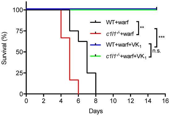 Genetic evidence that VKORC1L1 is not the warfarin resistant vitamin K quinone reductase present in the liver. Kaplan-Meier survival curves were determined for WT (n = 8) and Vkorc1l1−/− (c1l1; n = 6) mice, treated with either warfarin alone (150 mg/kg/day) or a combination of warfarin (warf; 150 mg/kg/day) and vitamin K1 (VK1; 15 mg/kg/day) for a maximum of 15 days (Mantel-Cox test, ** p < 0.01 and *** p < 0.001). WT: Wild-type; c1l1: Vkorc1l1; Warf: Warfarin; VK1; Vitamin K1.
