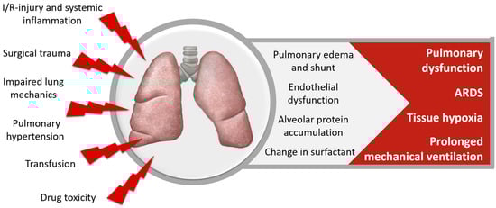 Factors contributing to pulmonary dysfunction are poor lung mechanics, increased intrapulmonary shunt and vascular resistance, pulmonary edema, changes in surfactant and alveolar protein accumulation. The underlying pathomechanisms include inflammation and free radicals, I/R-injury, transfusion-associated lung injury and drug toxicity. Pulmonary dysfunction causes prolonged need for mechanical ventilation, increases ICU- and hospital-LOS and mortality, and significantly affects long-term physical and psychological morbidity [3,96,97,98,99,100].