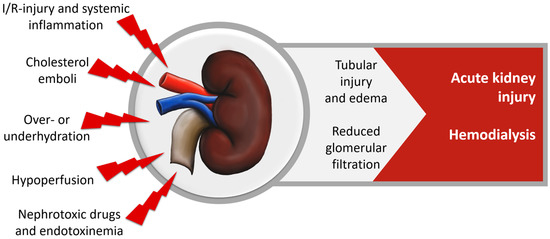 Acute kidney injury (AKI) is clinically one of the most significant organ dysfunction and occurs in about 28% of cardiac surgery patients [108], with 2–5% of patients requiring dialysis. Contributing factors are oxidative stress during renal I/R-injury, inflammation, hemolysis, cholesterol emboli, nephrotoxic drugs and toxins resulting in glomerular and tubular damage, reduced glomerular filtration rates and impaired creatinine clearance, as shown in Figure 5. AKI is strongly associated with the need for renal replacement therapy, increased hospital- and ICU-LOS, mortality and decreased long-term quality of life [3,108,109,110,111,112,113,114].