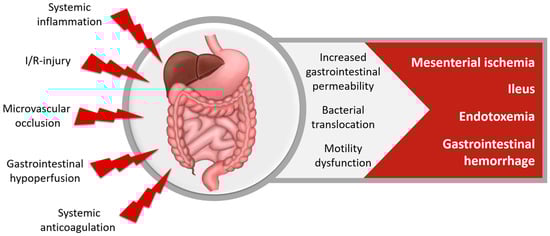 Gastrointestinal (GI) complications (Figure 6) occur in 0.2–4% [120], while a postoperative gastrointestinal atony is observed in most cardiac surgery patients [121,122]. Inflammation and I/R-injury increase GI permeability and can lead to bacterial translocation and systemic endotoxemia. The most common GI complications are postoperative ileus and GI hemorrhage, while mesenteric ischemia and intestinal perforation are GI complications with the highest mortality. GI complications increase LOS and mortality [3,10,123,124,125].