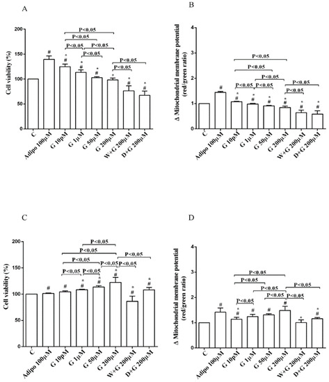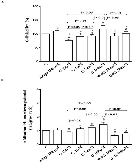 Effects of genistein in pre-adipocytes, cultured in physiological condition, on cell viability (A) and mitochondrial membrane potential (B): In A and B, the effects of genistein (G) 10 pM, 1 µM, 50 µM and 200 µM, adiponectin (Adipo; 100 µM), wortmannin (W; 200 µM), dorsomorphin (D; 200 µM). C = control. Reported data are means ± SD of five independent experiments for each experimental protocol executed in adipocytes taken from each patient. Significance between groups: # p < 0.05 vs. control; * p < 0.05 vs. Adipo 100 µM. Short square brackets indicate significance between groups (p < 0.05).