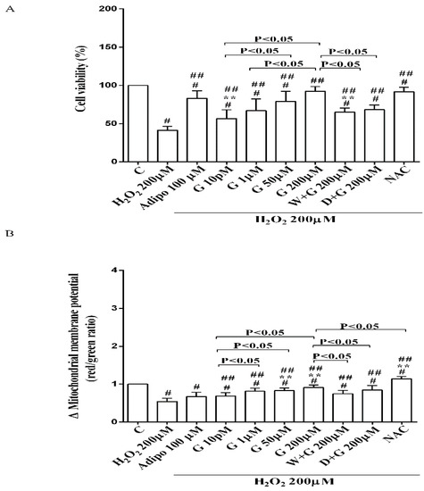 Effects of genistein in pre-adipocytes, cultured in peroxidative condition, on cell viability (A) and mitochondrial membrane potential (B). N acetyl-cysteine (NAC, 200 µM). Other abbreviations are as in previous figures. Reported data are means ± SD of five independent experiments for each experimental protocol executed in adipocytes taken from each patient. Significance between groups: # p < 0.05 vs. control; ## p < 0.05 vs. H2O2 200 µM; ** p < 0.05 vs. Adipo 100 µM + H2O2 200 µM. Short square brackets indicate significance between groups (p < 0.05).