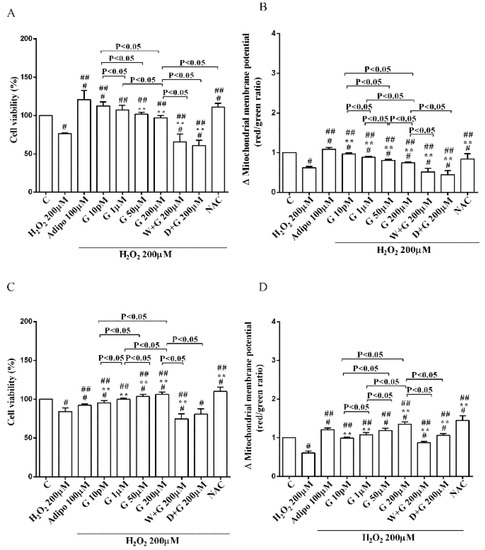 Effects of genistein in white adipocytes, cultured in peroxidative condition, on cell viability (A) and mitochondrial membrane potential (B), and in brown adipocytes, on cell viability (C) and mitochondrial membrane potential (D). Abbreviations are as in previous figures. Reported data are means ± SD of five independent experiments for each experimental protocol executed in adipocytes taken from each patient. Significance between groups: # p < 0.05 vs. control; ## p < 0.05 vs. H2O2 200 µM; ** p < 0.05 vs. Adipo 100 µM + H2O2 200 µM. Short square brackets indicate significance between groups (p < 0.05).