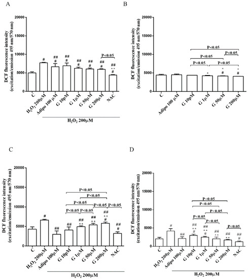 As shown in Figure 6, adiponectin reduced ROS production caused by 200 µM H2O2 in pre-adipocytes (Figure 6A) and in both white (Figure 6C) and brown (Figure 6D) adipocytes. Those effects were lower than those caused by NAC (Figure 6A,C,D). Moreover, in white adipocytes, genistein reduced ROS production caused by 200 µM H2O2 in a way that was inversely related to the dose. Similar findings were observed in pre-adipocytes and brown adipocytes although they were related to the dose of genistein. It is to note that in physiological conditions, only concentration higher than 50 µM genistein was able to reduce ROS release (Figure 6B).
