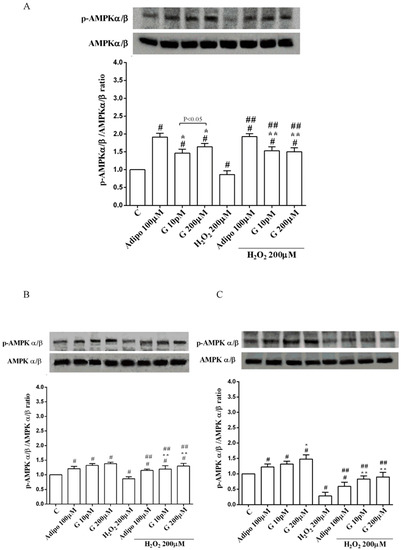 Effects of genistein on AMPKα/β activation in pre-adipocytes (A), white adipocytes (B) and brown adipocytes (C), cultured in physiological and peroxidative conditions: Abbreviations are as in previous figures. Reported data are means ± SD of five independent experiments for each experimental protocol executed in adipocytes taken from each patient. Significance between groups: # p < 0.05 vs. control; * p < 0.05 vs. Adipo 100 µM; ## p < 0.05 vs. H2O2 200 µM; ** p < 0.05 vs. Adipo 100 µM + H2O2 200 µM. Short square brackets indicate significance between groups (p < 0.05).