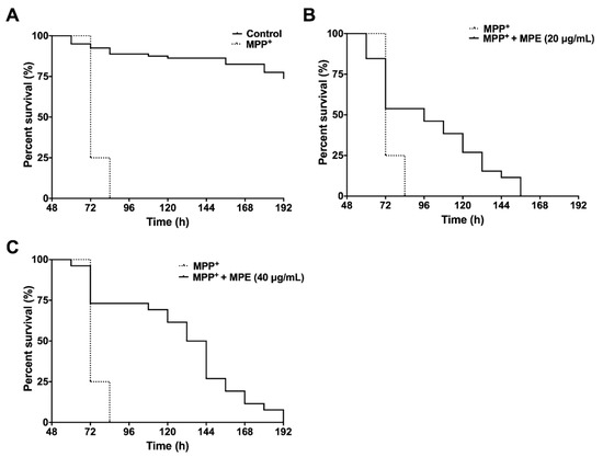 Effects of MPE (20 and 40 μg/mL) on lifespan of C. elegans after MPP+ exposure. MPP+ at concentration of 750 μM reduces C. elegans lifespan, as compared with control group (A). MPE at concentrations 20 μg/mL (B) and 40 μg/mL (C) increase C. elegans lifespan, as compared with toxic MPP+ exposure (750 μM). Survival curves of C. elegans were statistically analyzed by log rank test (Mantel Cox), as compared with MPP+ treatment (n > 100).